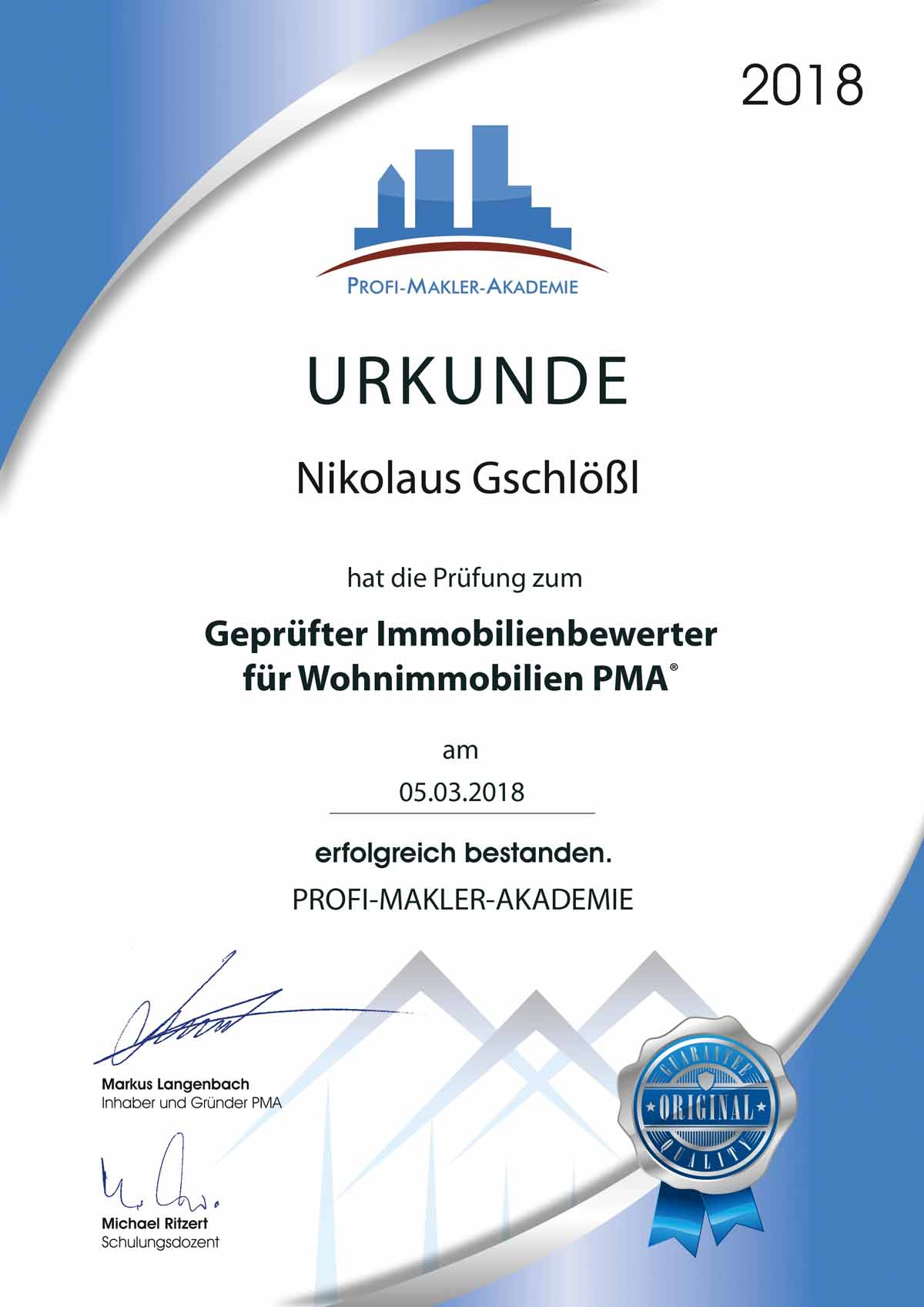 Zertifikat Weiterbildung zum PMA Profimakler